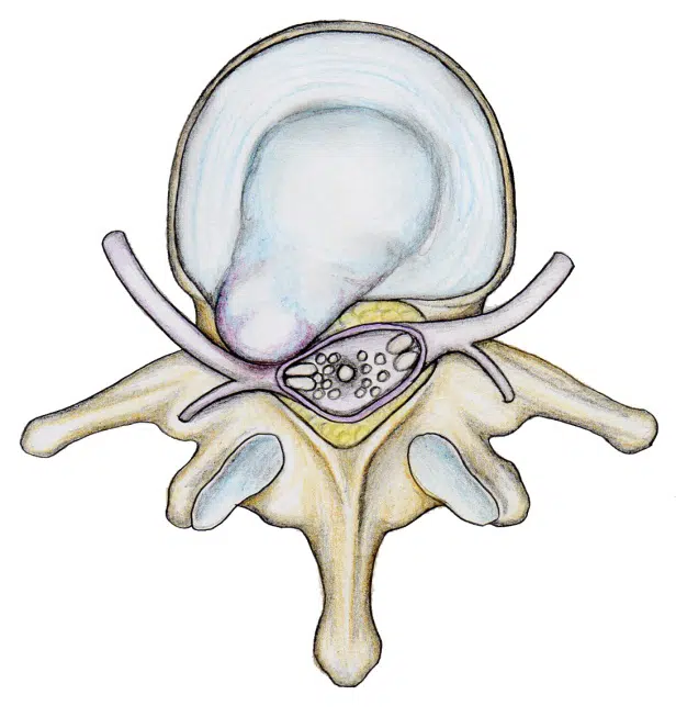 Dans certains cas, l’anneau se déchire spontanément ou suite à un faux mouvement. Le noyau va alors venir comprimer un nerf périphérique descendant dans la jambe et causer des douleurs neuropathiques. On parle alors de hernie discale.